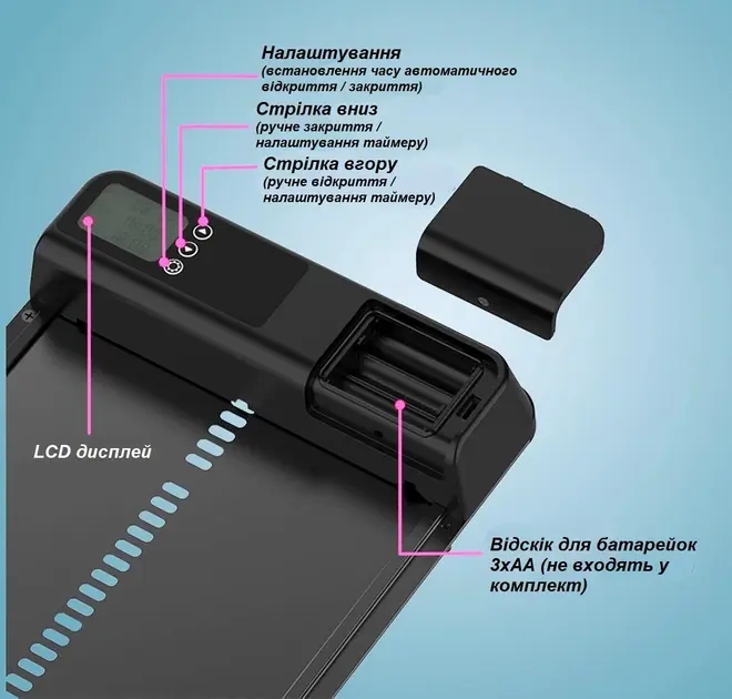 Надійна заслонка з металевим механізмом забезпечує захист від хижаків (лисиць, єнотів, тхорів), а також зберігає тепло всередині курника. Працює автономно на батарейках або від USB-джерела живлення.