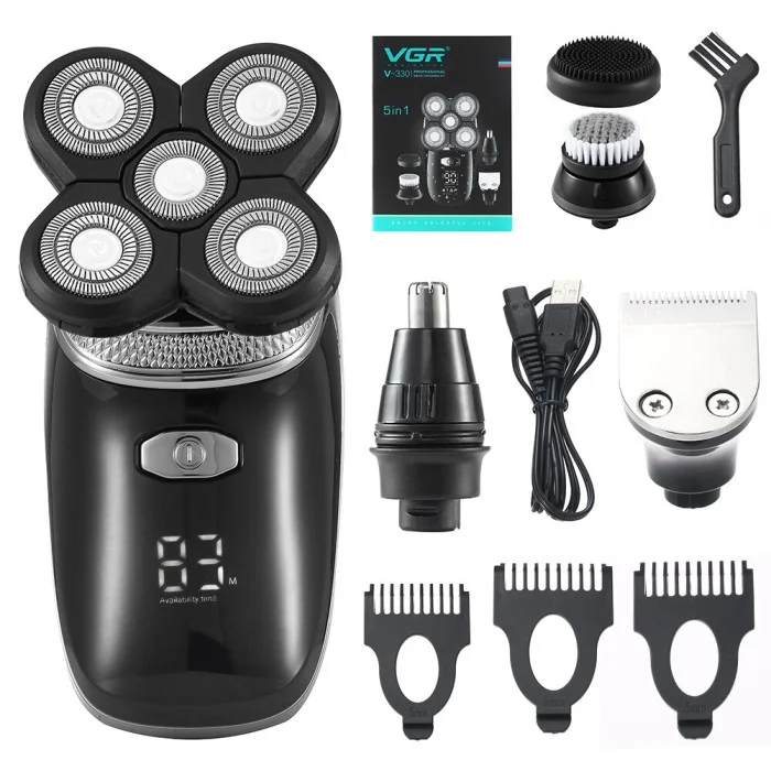 VGR V-330 — це бездротова електробритва 5в1 з потужним акумулятором, вологозахистом IPX6 та змінними насадками. Ідеальний варіант для щоденного догляду за обличчям і волоссям як вдома, так і в дорозі.