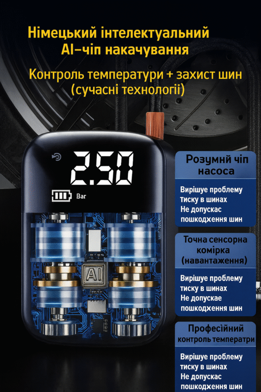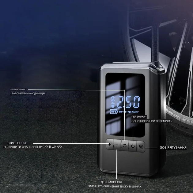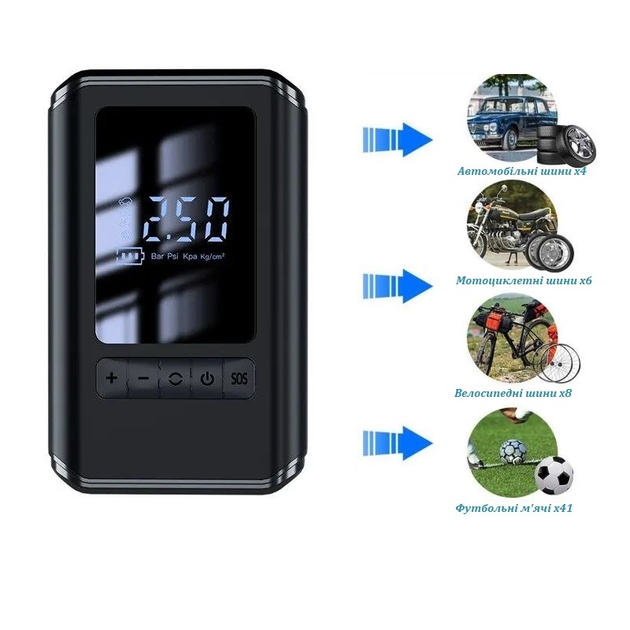 | Функції | Компресор, повербанк, LED-ліхтарик (3 режими), живлення від прикурювача |