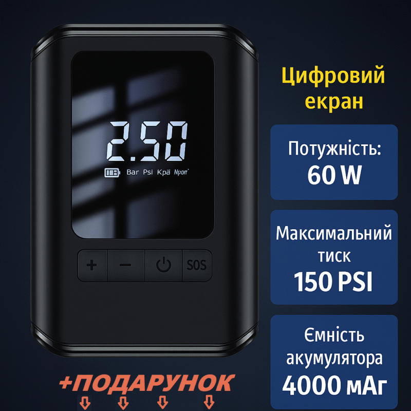Компактний, стильний і зручний автокомпресор — ідеальний помічник для накачування шин автомобіля, мотоцикла, велосипеда, м’ячів та інших надувних виробів. Оснащений цифровим дисплеєм, підтримує 4 режими вимірювання тиску, має функцію автоматичного відключення після досягнення заданого значення. Потужний LED-ліхтарик з трьома режимами освітлення стане в пригоді у темний час доби, а функція повербанка дозволяє заряджати смартфони та інші гаджети через USB.