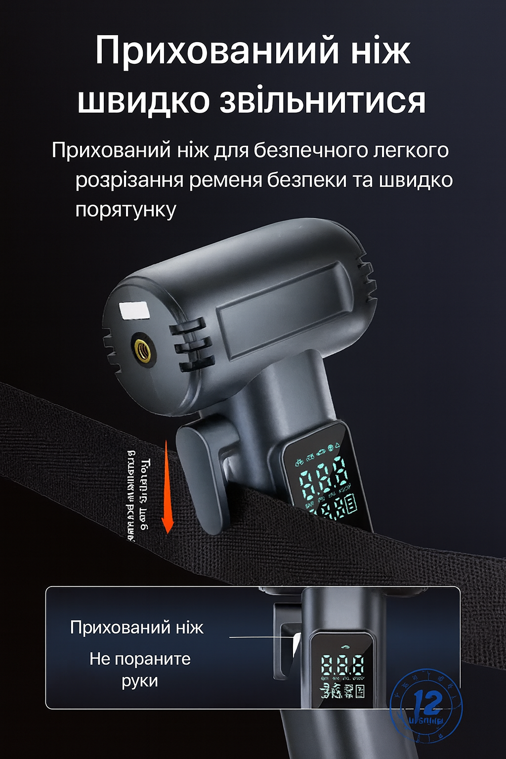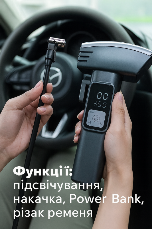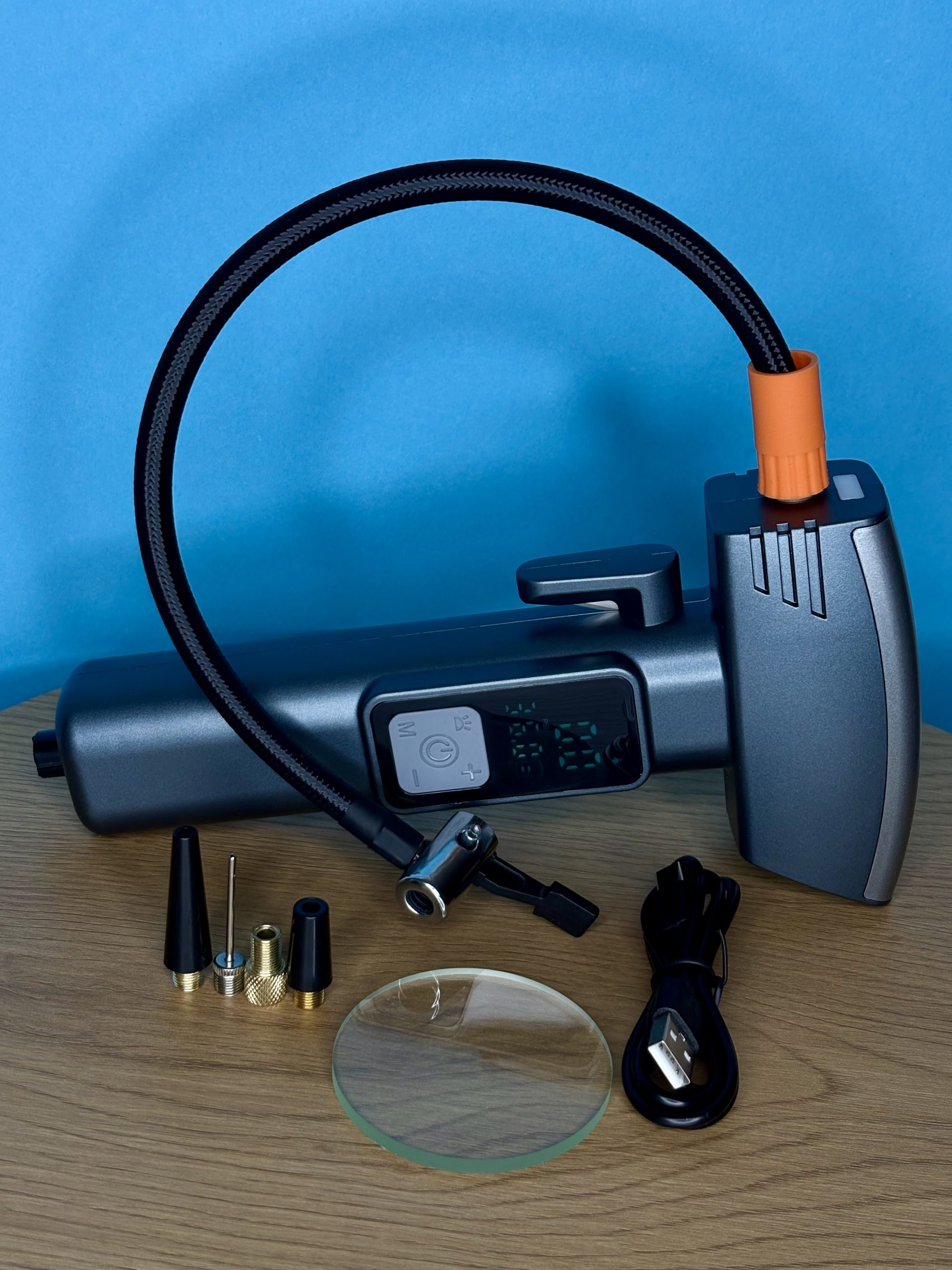 Потужний мотор, вбудований акумулятор та LED-ліхтарик дозволяють швидко накачати колеса, м’ячі чи інші надувні вироби — де завгодно і коли завгодно.