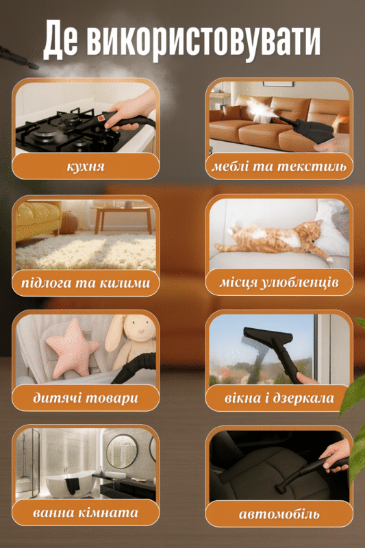 - 🧹 Універсальне застосування — для підлоги,авто,плитки, кахлю, сантехніки, кухонних поверхонь, вікон, килимів, одягу тощо.