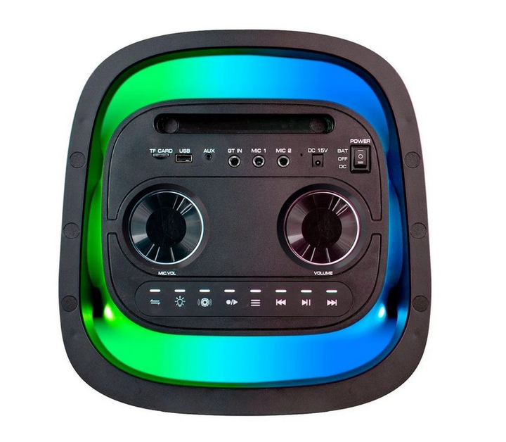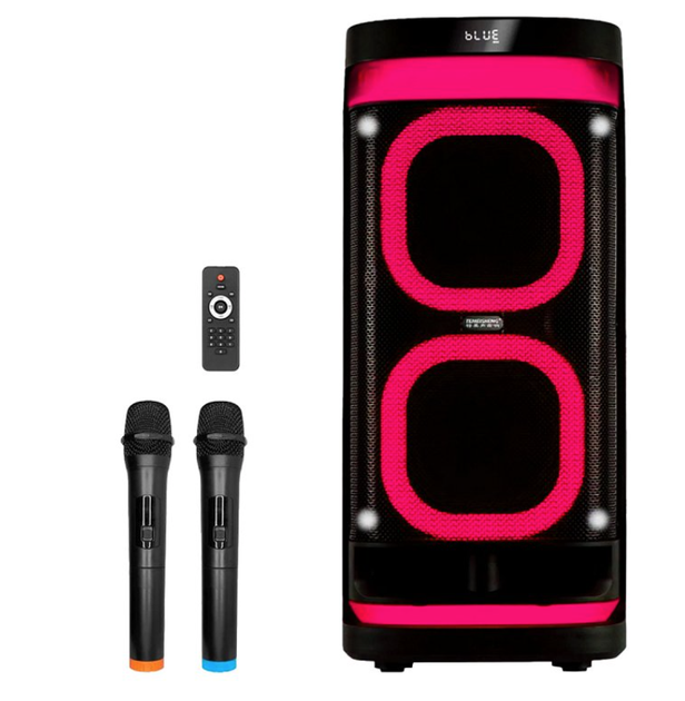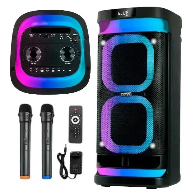 Потужна акустична система з двома 8-дюймовими динаміками, підтримкою Bluetooth, функцією караоке та яскравим LED-підсвічуванням — ідеальний вибір для вечірок, виїздів на природу та домашнього прослуховування музики.