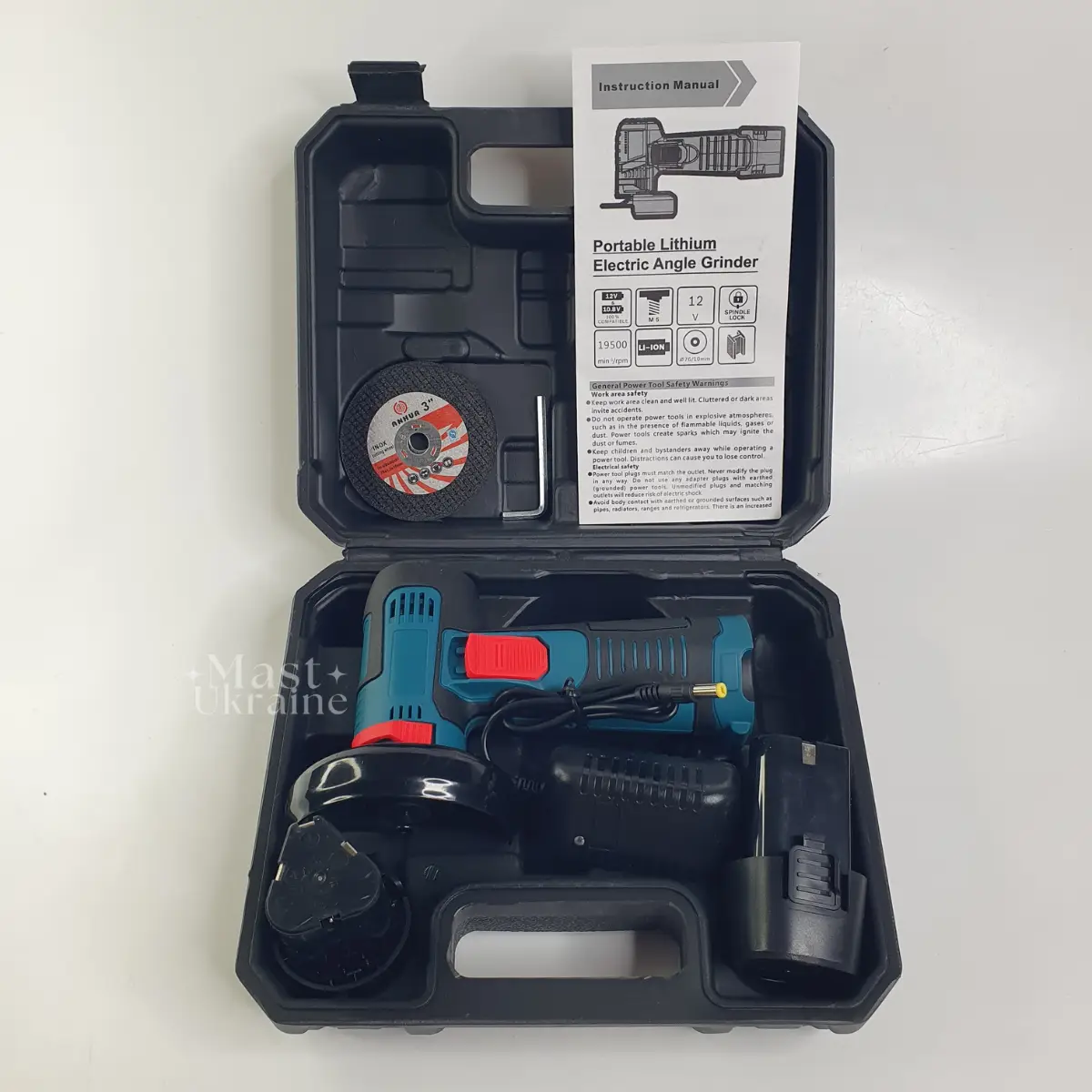 ✔️ Болгарка Meterk 12V ✔️ Акумулятор (1 або 2 шт — залежно від комплектації) ✔️ Зарядний пристрій ✔️ Ключ для заміни диска ✔️ Захисний кожух ✔️ Диски (шліфувальні/відрізні — якщо передбачено) ✔️ Фірмовий кейс