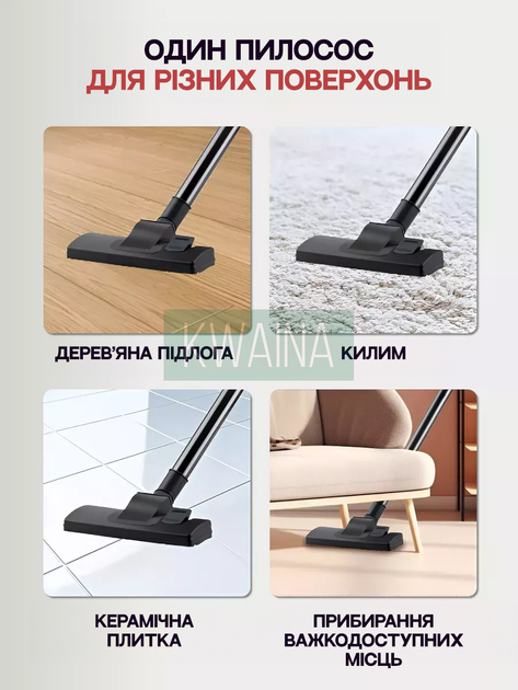 Працює від звичайної розетки 220В, що гарантує постійну силу всмоктування без необхідності заряджати батарею. Надійна система фільтрації затримує навіть найдрібніші частинки пилу, очищуючи повітря в приміщенні.