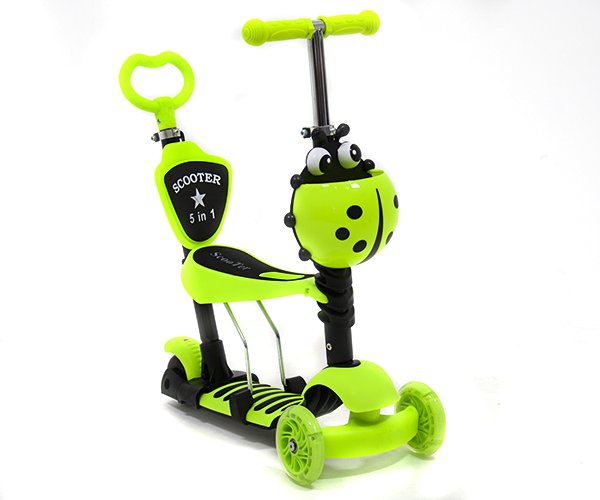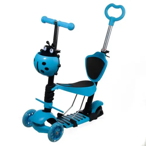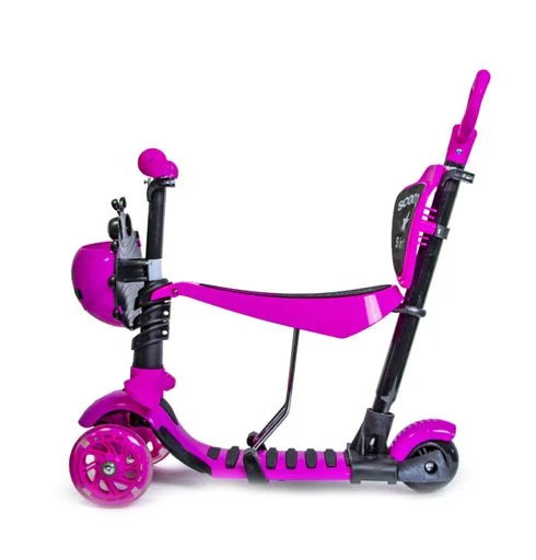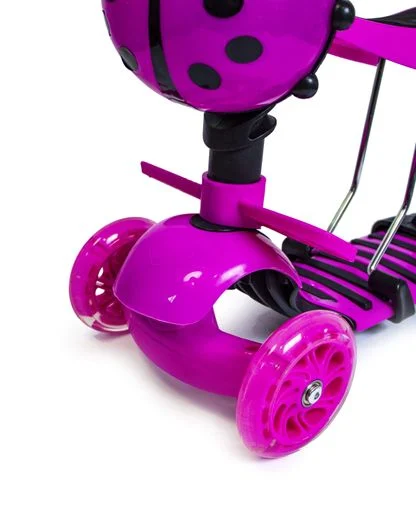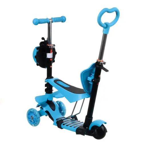 Конструкція оснащена знімним сидінням, підніжкою та ручкою для батьків, що дозволяє використовувати його як прогулянковий транспорт. Коли малюк підростає, сидіння знімається — і самокат перетворюється на класичний трьохколісний.