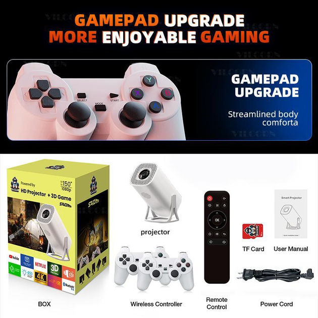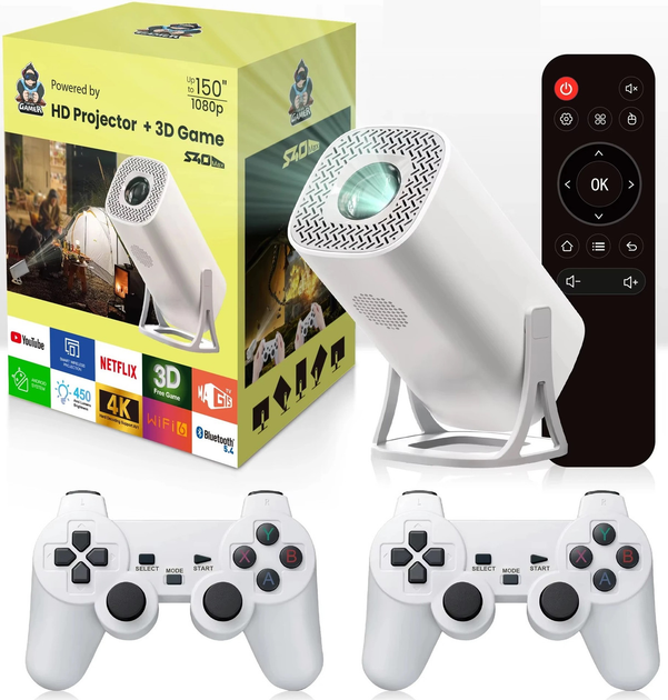 Ідеальне рішення для розваг удома або в поїздці: Smart-проєктор S40 оснащений вбудованою ігровою приставкою, двома Bluetooth-джойстиками, Wi-Fi, а також підтримує відео у форматі до Full HD. Під’єднуйтеся до YouTube, Netflix, дивіться фільми, грайте в класичні 8/16-бітні ігри або транслюйте з телефону!