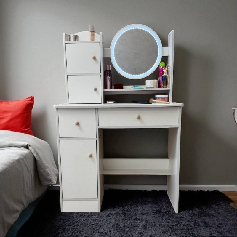 TT811 — сучасний і функціональний туалетний столик для макіяжу з великою дзеркальною панеллю, LED-підсвіткою, зручними шафками та полицями для зберігання косметики, прикрас і аксесуарів. Ідеально доповнить інтер’єр спальні або гардеробної.